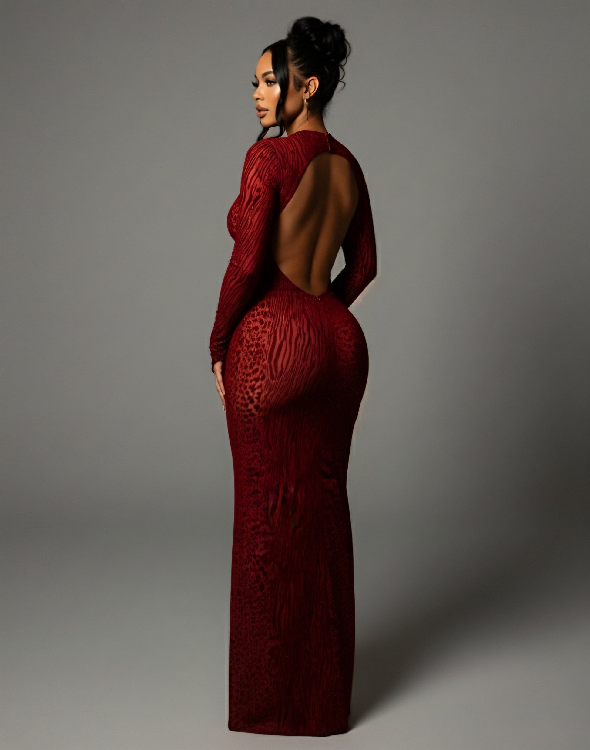 The Ashley mesh maxi dress features a bold mix of tiger, leopard, and zebra prints. With long sleeves and a high neckline, it offers a sleek front, while the dramatic open-back cut-out adds elegance and allure. Perfect for standout evening events.
