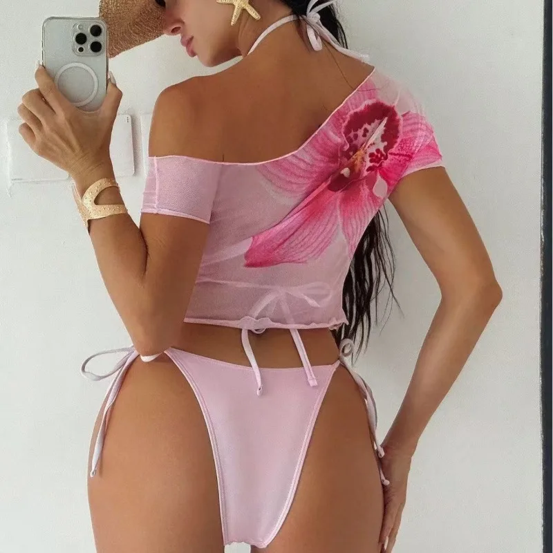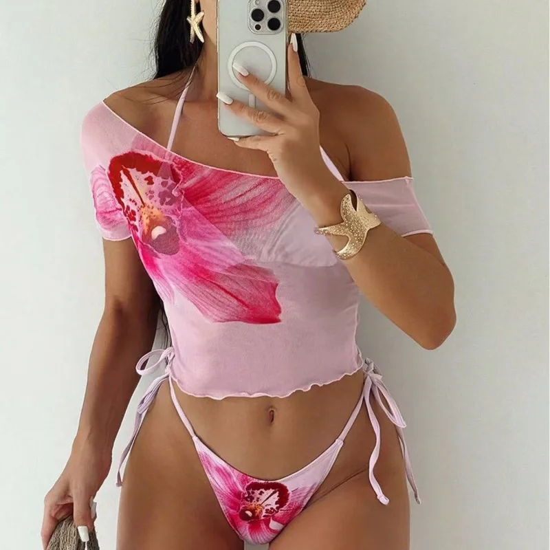 Cyflymder Women Three Piece Bikini Set Vintage Floral Print Lace Up Micro Bikini Mesh Short Sleeve Tops Cover-Up Beach Pool Party Swimsuit