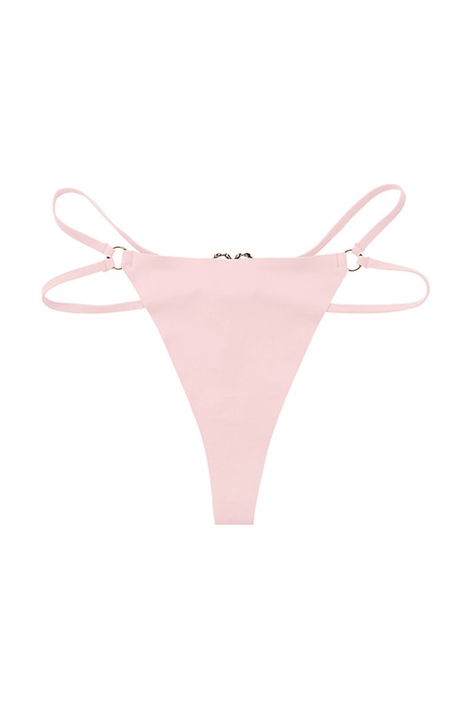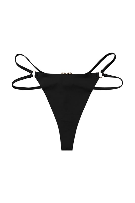 String épuré en microfibre douce, pensé pour sublimer les hanches grâce à ses doubles lanières réglables. À l’arrière, un bijou en forme de cœur doré vient souligner la chute de reins avec sensualité. Coupe ficelle, effet seconde peau, disponible en noir, blanc et rose poudré.
