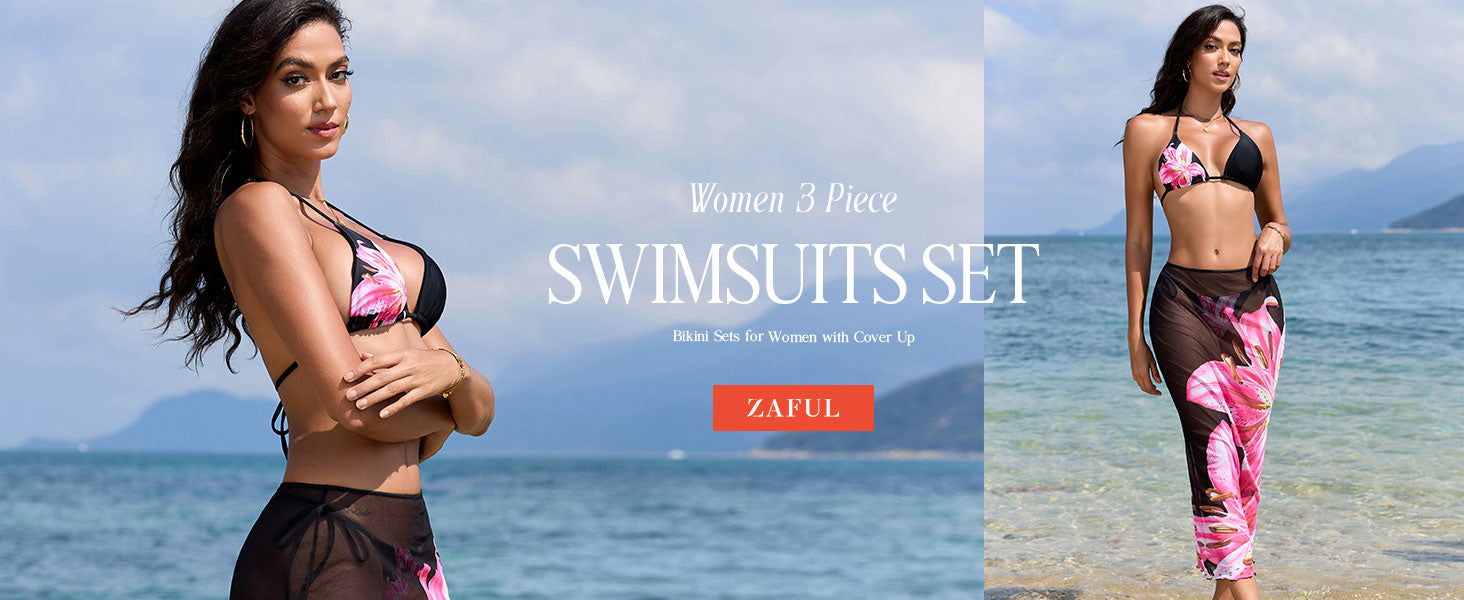 This women's 3-piece swimsuit set includes a floral halter triangle bikini top and adjustable tie-side bottoms, designed to provide a customizable and comfortable fit. The long sheer cover-up skirt adds a sophisticated layer, perfect for beachside lounging or poolside events. Combining stylish floral patterns with functional design, this set offers both elegance and practicality for your swimwear wardrobe.